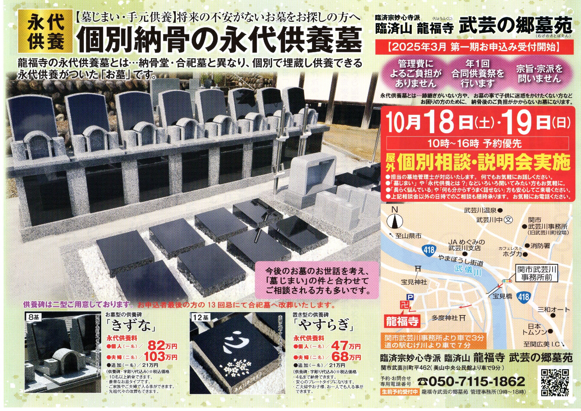 関市武芸川町平(関市武芸川事務所寄り車3分)「龍福寺武芸の郷墓苑[りょうふくじむげのさとぼえん]」に待望の個別埋蔵できる永代供養墓誕生 【きずな:全8基/やすらぎ:全16基(残12基)】